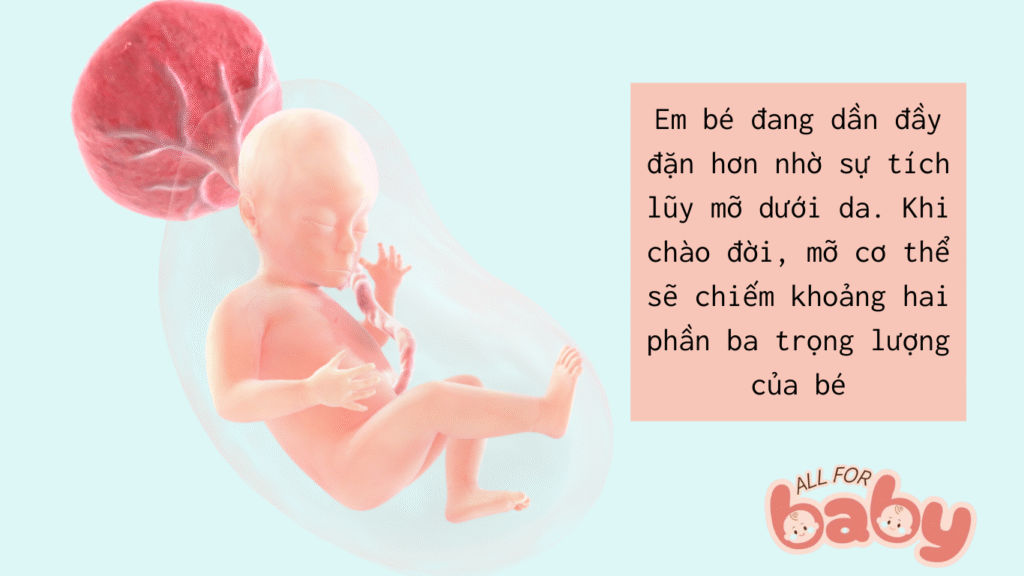Dây rốn khỏe mạnh: Lúc này, dây rốn đang dày lên, chắc hơn và đủ sức cung cấp dinh dưỡng – loại bỏ chất thải từ cơ thể bé. Đến cuối thai kỳ, dây rốn có thể dài tới 50–60cm.